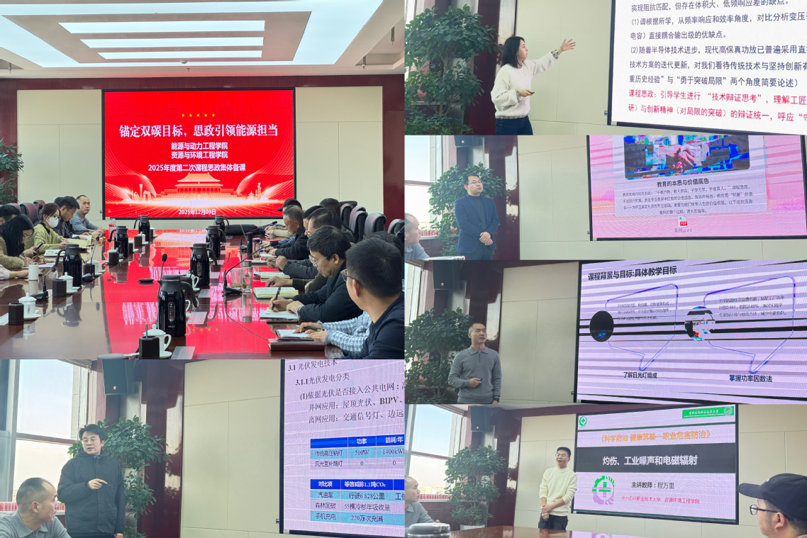 为全面贯彻落实党的二十大及历次全会精神和习近平新时代中国特色社会主义思想,深入贯彻落实立德树人根本任务,根据教育厅和学校相关文件精神,2025年12月9日下午15:30,能源与动力工程学院与资源环境工程学院联合举办课程思政集体备课活动。活动围绕“深挖思政元素,凝练地勘精神,夯实技能强国”、“锚定双碳目标,思政引领能源担当” 两大核心主题,共探课程思政教学创新路径。两院全体教职工参加本次活动,能源与动力工程学院教学负责人主持。